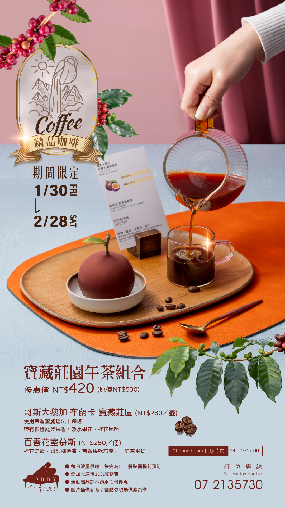漢來優惠活動 - 《高雄漢來 大廳酒廊》寶藏莊園午茶組合:即日起-2/28(六)期間限定的寶藏風味,邀您品嚐精品咖啡與甜點的完美交會!