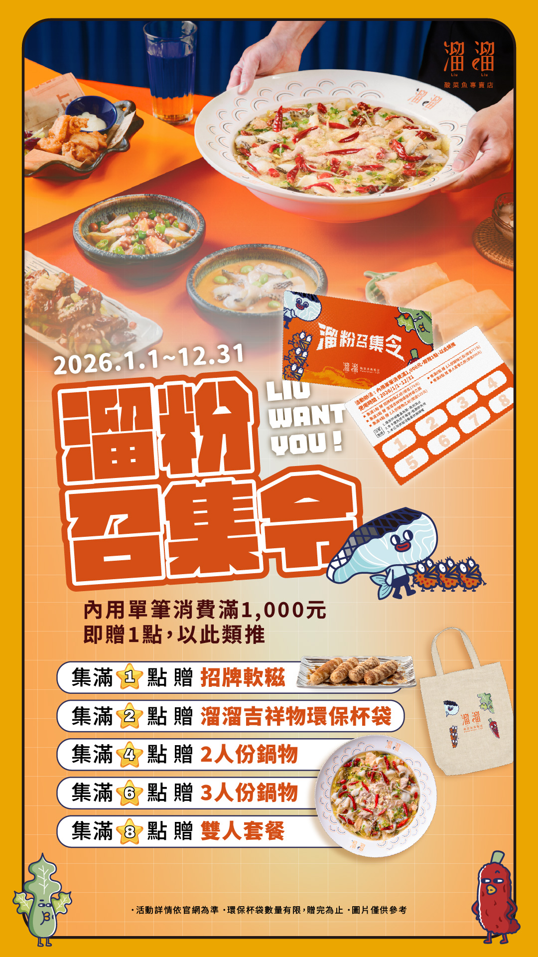 漢來優惠活動 - 《溜溜酸菜魚專賣店》溜粉召集令 點點成美味:即日起~2026/12/31,內用單筆消費滿 $1,000 即贈 1 點,以此類推~