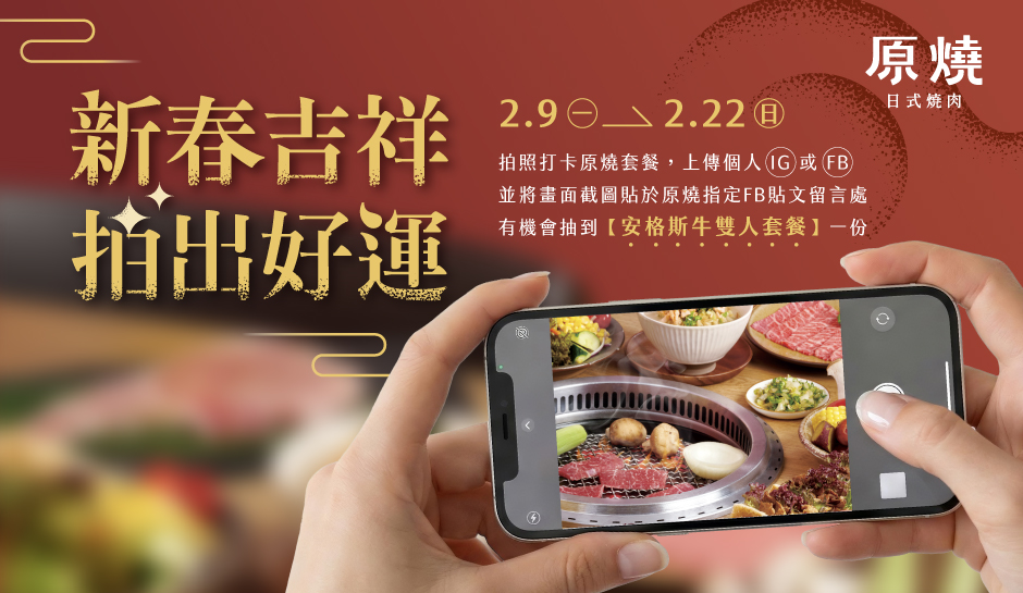 活動內容:2/9-2/22活動期間內拍照打卡原燒套餐,上傳至個人IG 或 FB,並將打卡畫面貼於原燒指定FB貼文留言處,有機會抽到「安格斯牛雙人套餐」一份