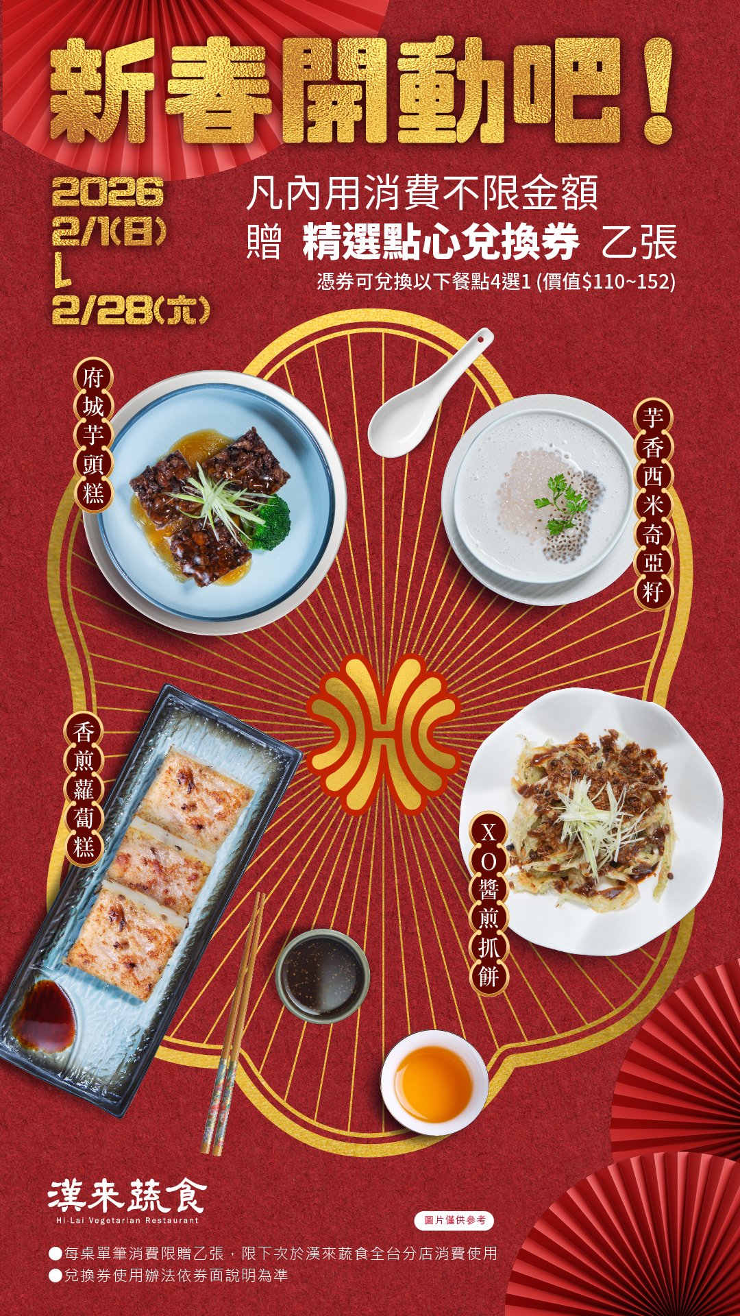 漢來優惠活動 - 《漢來蔬食》新春開動吧!:2026/2/1~2/28內用消費不限金額,贈「精選點心兌換券」乙張,開春一起歡聚開動吧!