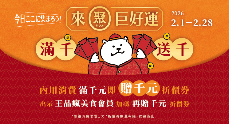 2026/2/1~2/28來店內用消費,消費金額滿$1,000,即贈$1,000紙本折價券。