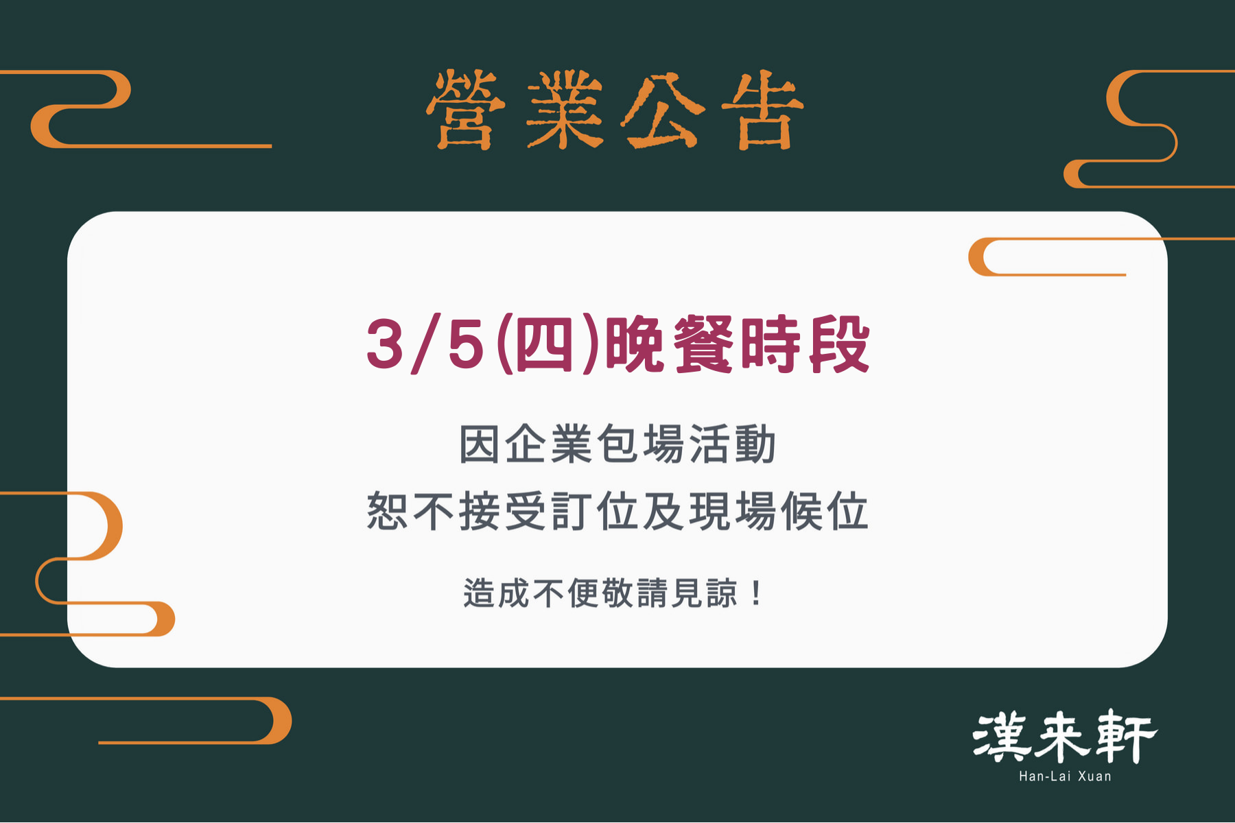 漢來優惠活動 - 《漢來軒》營業公告:2026年3月部分日期因企業包場活動,恕不開放訂位