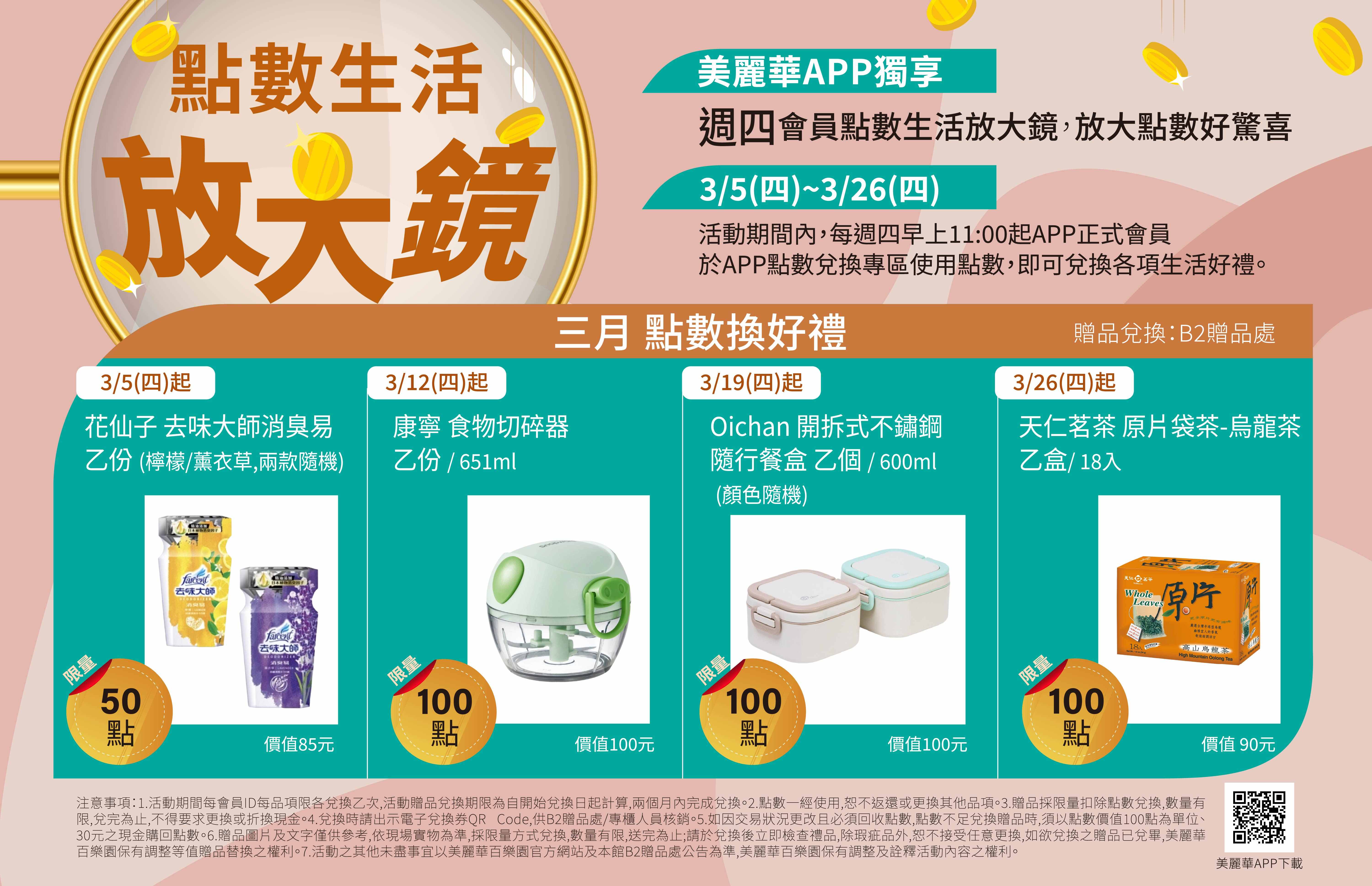 活動期間,每週四早上11:00起,APP正式會員於APP點數兌換專區使用點數即可兌換各項生活好禮。