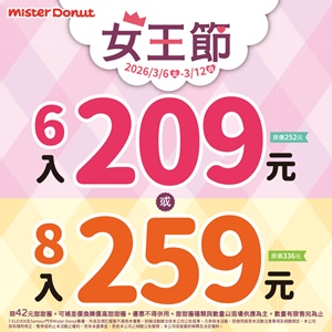 任選6入或8入甜甜圈可享209或259元甜甜價!
