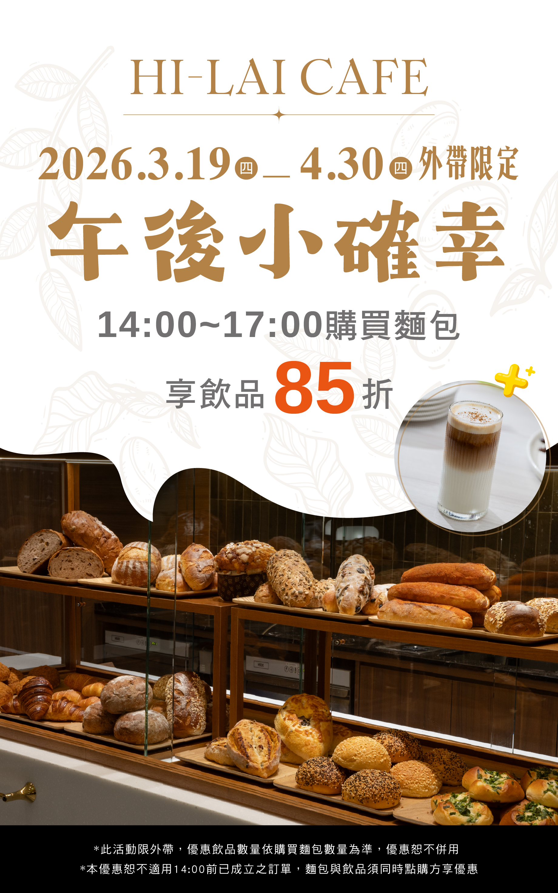 漢來優惠活動 - 《HI-LAI CAFE-高雄漢神巨蛋店》午後小確幸 外帶限定:3/19(四)~4/30(四) 14:00~17:00外帶烘焙區麵包,享飲品 85 折加購優惠❗