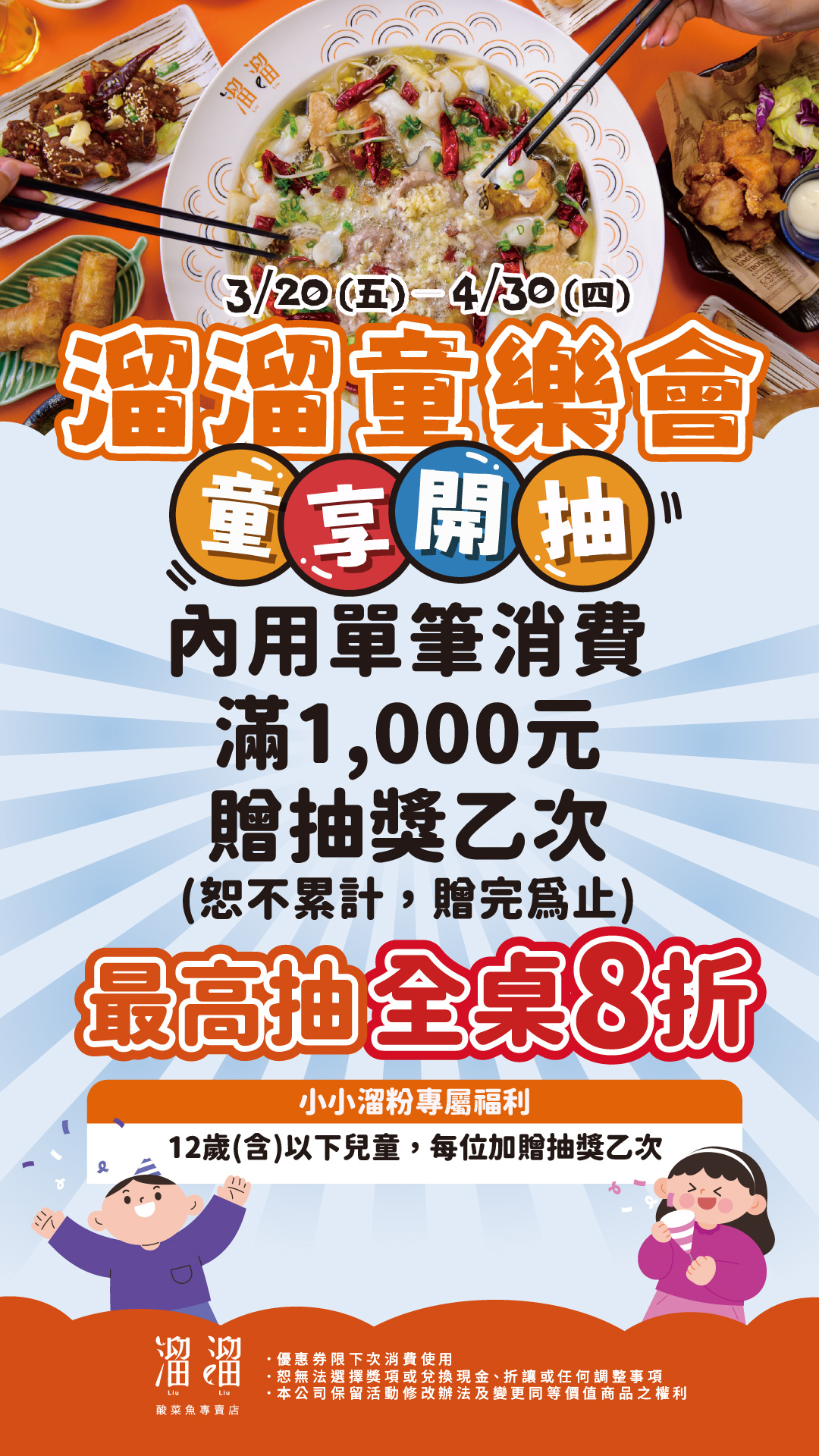 漢來優惠活動 - 《溜溜酸菜魚專賣店》溜溜童樂會 童享開抽:3/20(五)~4/30(四)內用單筆消費滿 $1,000,即可獲得「抽獎機會乙次」?