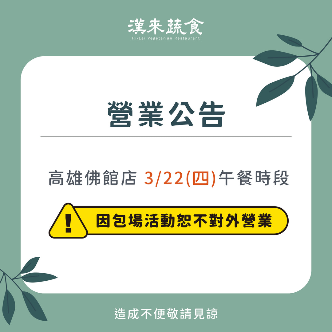 漢來優惠活動 - 《漢來蔬食》高雄佛館店2026年3月營業公告:漢來蔬食高雄佛館店因包場活動,3/22(日)午餐時段恕不開放訂位,造成不便敬請見諒!