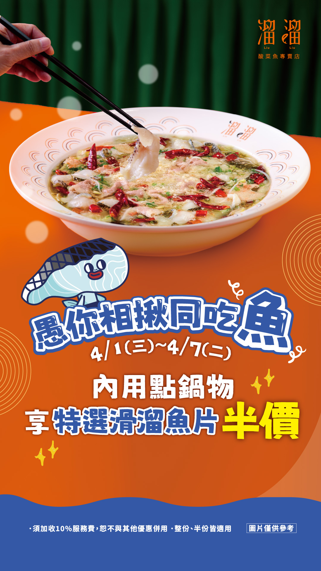 漢來優惠活動 - 《溜溜酸菜魚專賣店》愚你相揪同吃「魚」:? 4/1(三)~4/7(二)內用點鍋物享 特選滑溜魚片✨加購半價✨