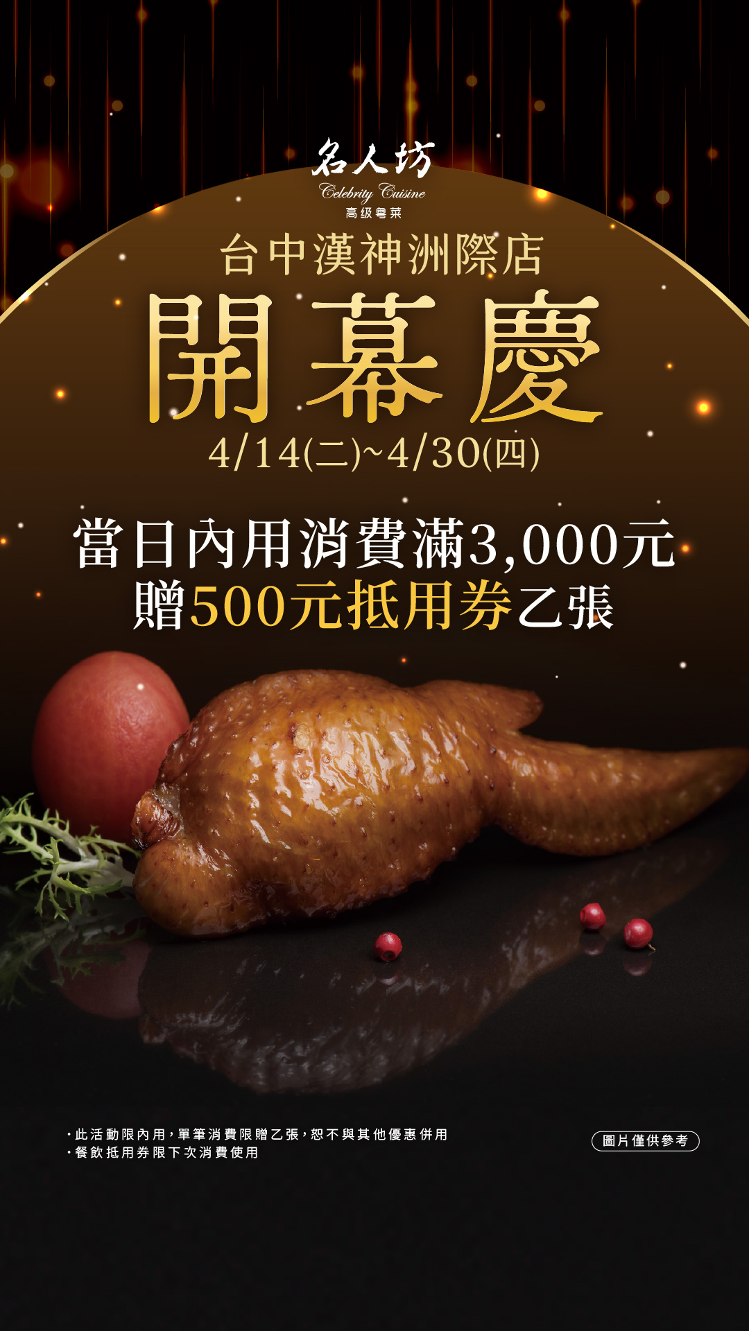 漢來優惠活動 - 《漢來名人坊-台中漢神洲際店》開幕慶:?4/14(二)~4/30(四) 內用單筆消費滿 NT$3,000,即贈 NT$500抵用券 乙張