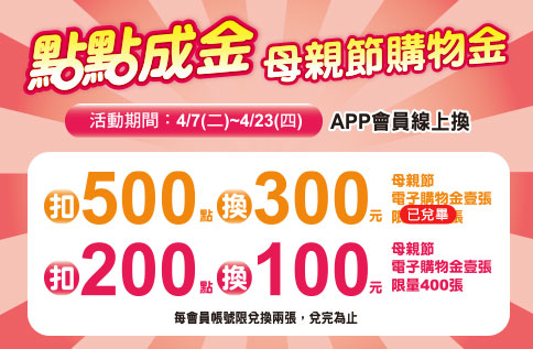 扣200點換100元母親節電子購物金壹張(限量400張),每會員帳號限兌換兩張,兌完為止。
