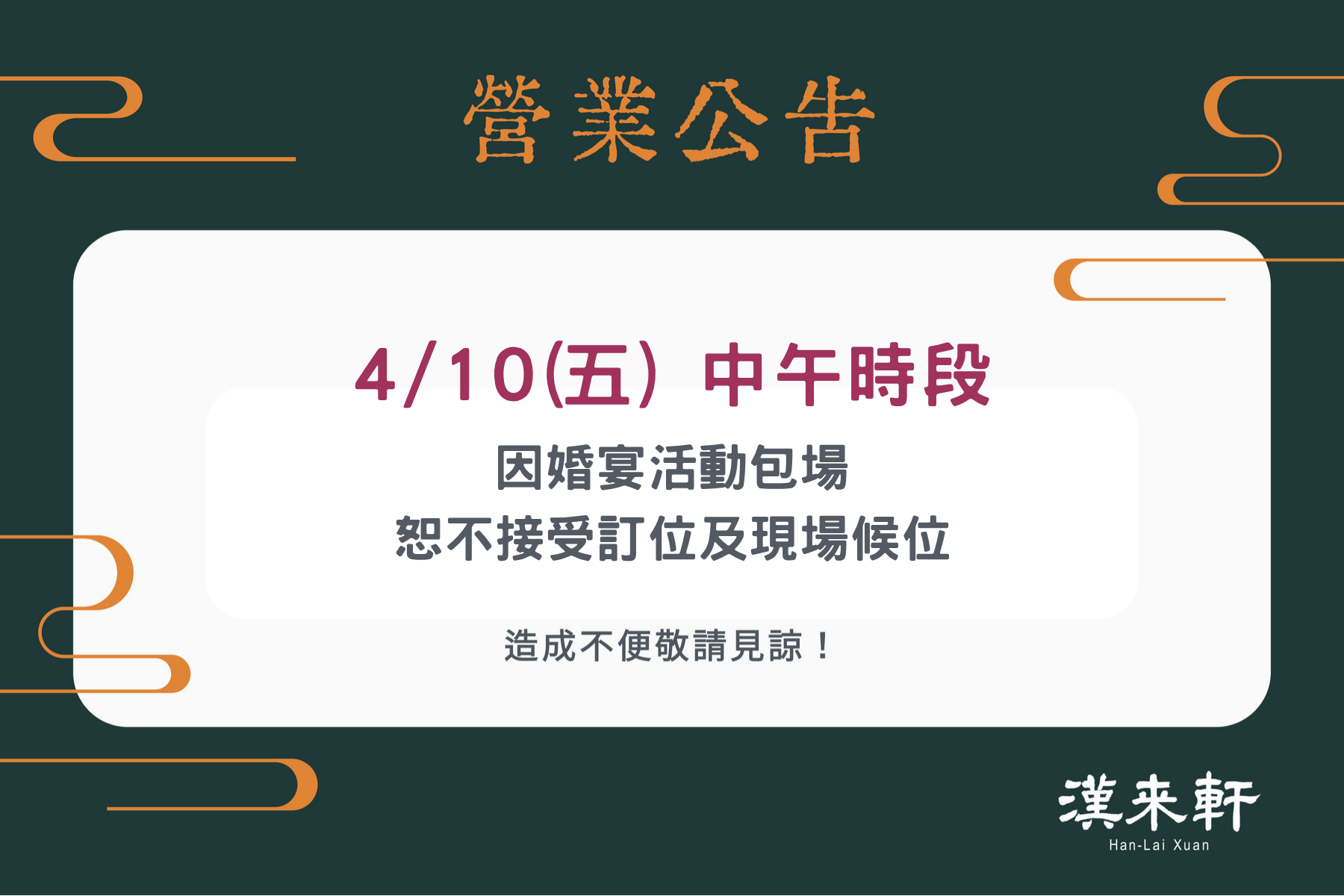 漢來優惠活動 - 《漢來軒》營業公告:2026年4月部分日期因企業包場活動,恕不開放訂位