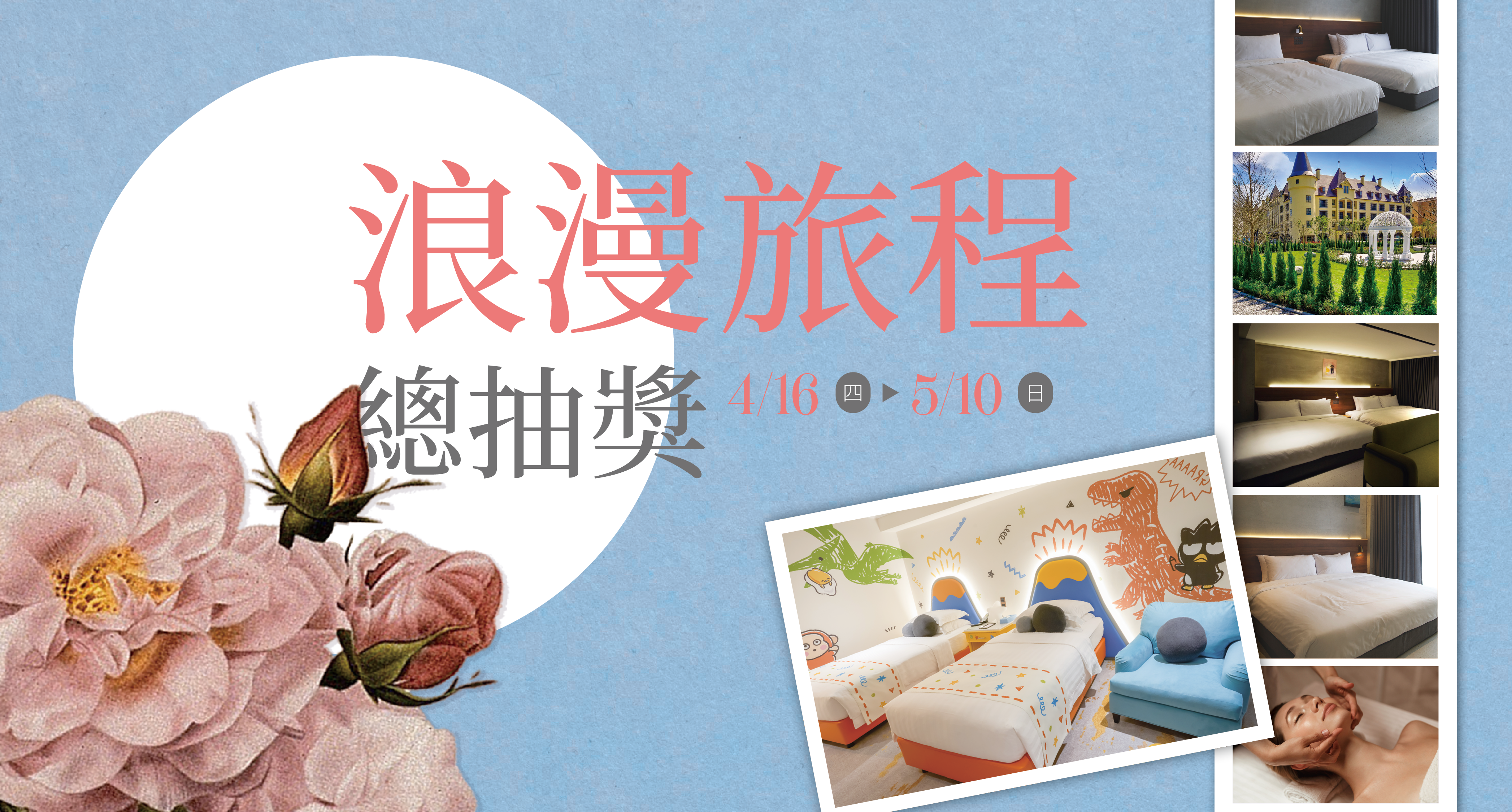全館活動2026-04-16 漫遊花間 總抽獎 浪漫旅程總抽獎 開啟你的夢幻假期! 開店慶浪漫旅程總抽獎 漢來獎|1名 瑞穗獎|1名 三富獎|1名 三富獎|1名 三富獎|1名 美體獎|1名 舒活獎|1名 簡單 3 步驟,立即註冊升級漫遊花間 總抽獎