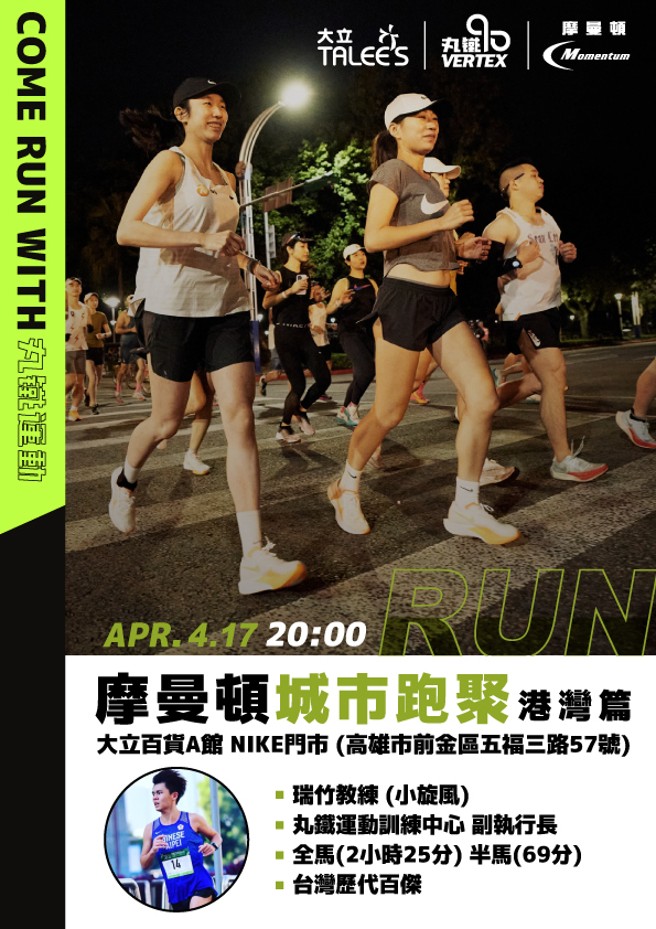 將日常的疲憊轉化為前進的動力,高雄大立攜手 摩曼頓 與丸鐵運動,邀請你一起加入夜跑行列,在城市中感受運動節奏與活力氛圍,開啟屬於你的健康生活。 活動資訊 活動日期|4/17(五) 活動內容 ・3km 團體輕鬆跑(中央公園) 教練介紹 瑞竹教練(小旋風) 活動限定優惠 凡參加當日跑聚活動者,即可享以下專屬優惠 : ・大立 A 館1F Nike 鞋類與服飾全面 7 折(on 與 HOKA 商品除外,實際優惠依現場公告為準) 在城市夜色中,用步伐感受節奏,用運動連結彼此。 LATEST NEWS 娛樂前線 | 摩曼頓×丸鐵運動 x 高雄大立|港灣跑聚2026-04-11