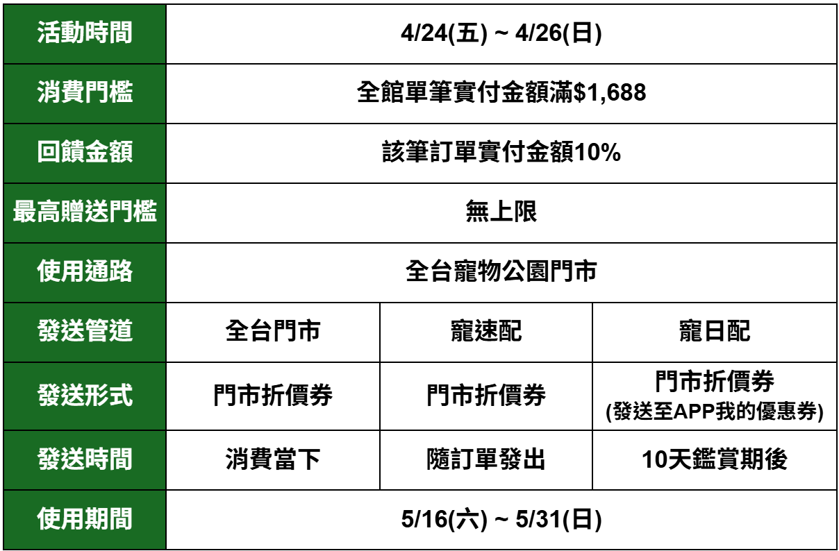 會員當日消費扣除適用折扣優惠券並排除特殊優惠商品,商品結帳實付金額滿 1,688元(含)以上,即可獲贈「現金折價券」。分批取、美容、住宿、水手兩棲爬蟲異寵櫃位、水族星球櫃位、魚部落專櫃恕不參與本優惠活動。折價券面額依「商品結帳實付金額 × 10%」計算,小數點後採四捨五入,面額無上限。折價券將於結帳後由收銀櫃台直接列印發放。門市、寵速配與寵日配現金折價券需於 2026年5月16日至2026年5月31日期間使用,逾期無效。折價券無消費金額限制,且折抵金額無上限。現金折價券限寵物公園會員本人使用,不可轉讓或贈送他人。門市/寵速配折價券為實體票券(寵日配為 APP 優惠券),塗改、影印或以任何形式複製皆屬無效。折價券如有破損無法辨識、遺失或逾期,恕不補發。使用折價券折抵時,需於結帳前出示實體票券,截圖或翻拍無效。折抵後,折價券將由櫃檯人員收回。每張折價券需一次性使用完畢,不可重複使用、不找零、亦不可儲值且不與任何優惠同時併用。辦理退貨時,需一併退回現金折價券,否則恕不接受退貨。折價券全品項皆可折抵但不適用於美容服務、住宿服務、藥品、水手兩棲爬蟲異寵櫃位、水族星球櫃位及魚部落專櫃。萬達寵物保留修改、變更、暫停或終止本活動內容之權利,恕不另行通知。