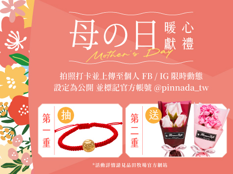 n 第二重:5/10 媽媽來店用餐,拍照打卡並上傳至個人 FB / IG 限時動態,設定公開並標記官方帳號 @pinnada_tw,即可獲得【香氛花束】乙份。*款式隨機,數量有限,贈完為止。