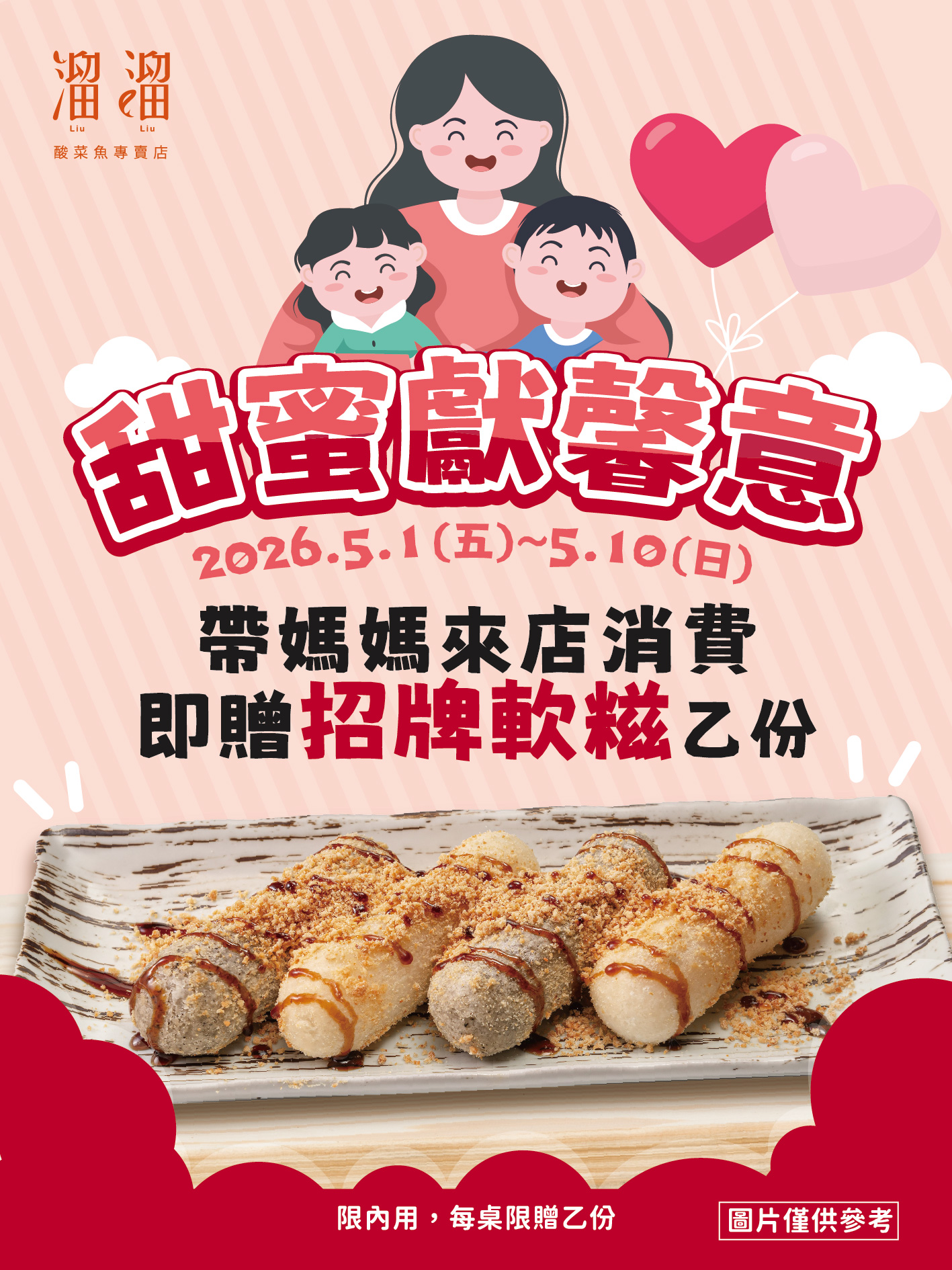漢來優惠活動 - 《溜溜酸菜魚專賣店》甜蜜獻馨意:?2026/5/1(五)~5/10(日)活動期間帶媽媽來店消費,即贈 #招牌軟糍 乙份✨